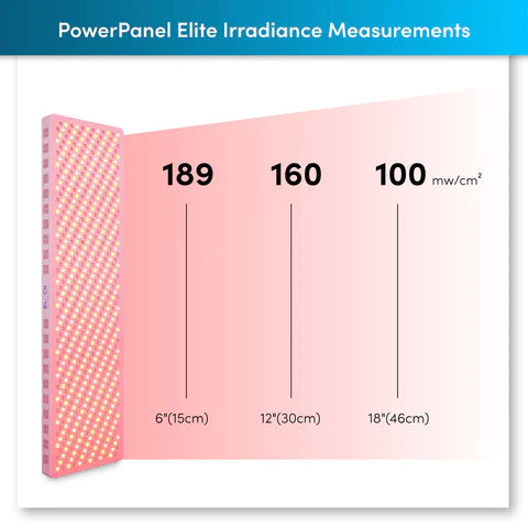 This panel delivers one of the highest measured irradiance levels on the market: up to 189mw/cm² at a distance of 6 inches (as measured with a solar meter), with an average reading of 90mw/cm² verified by light spectrometer testing. This high light intensity supports efficient light exposure sessions across a broad treatment area.
