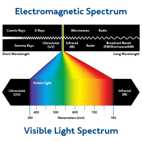 Wavelengths of light are measured in nanometres (nm), and they vary greatly, from the visible spectrum of colors like red, orange, yellow, green, blue, and violet, to the invisible spectrum of infrared and ultraviolet light.